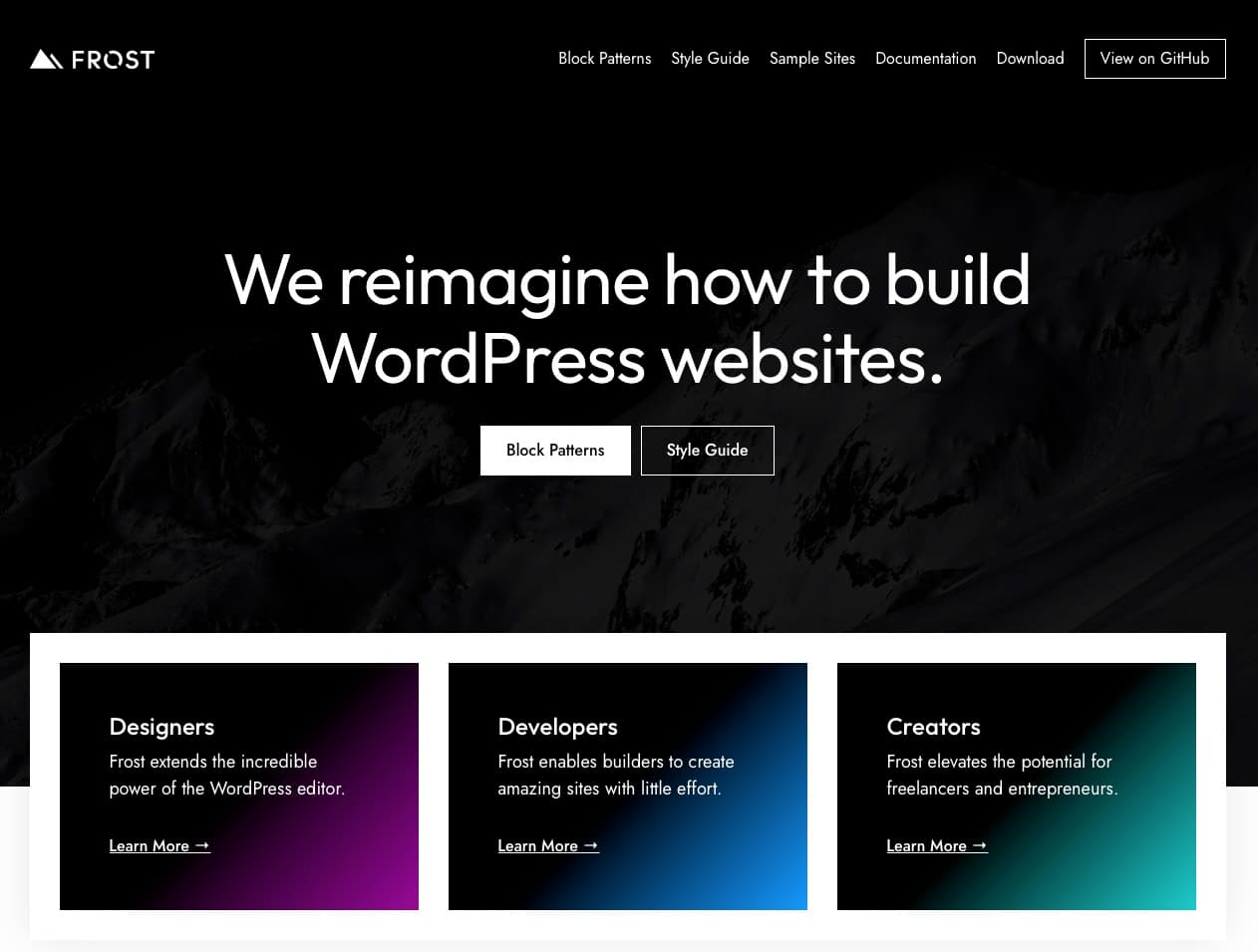 Leveraging the power of the WordPress editor, Frost is a full site editing block theme for designers, developers, and creators.